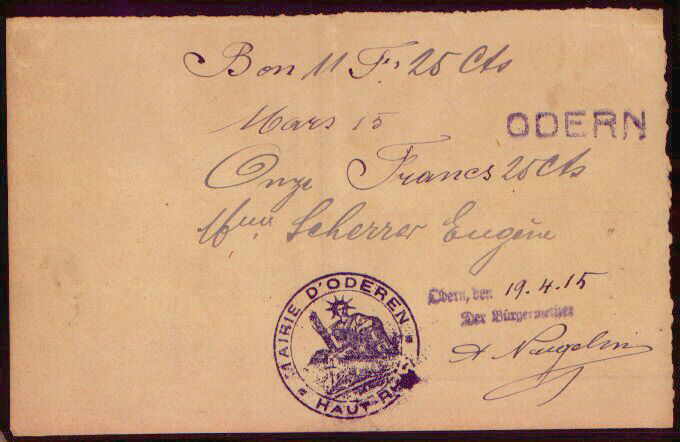 11 Francs 25 Centimes entsprachen damals 9 Mark (1: 1,25) Odern , Oberelsass 1915